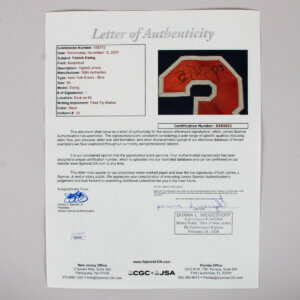 The jersey was signed by the great Patrick Ewing which in itself is absolutely AMAZING. The jersey itself has the proper Puma 1999-00 tagging. The size tag font and color “56′ differs from other Puma Knicks tagging. There is an extra length flag tag “Long” and does not read the normal “2lb” extra length flag tag. There is no year tag. A white sewn on swatch appears underneath the Knicks Puma tagging and is blank. The jersey is blue/black mesh with orange sewn on material striping. “EWING” NOB is sewn onto the mesh jersey. “33” player identifier is sewn on in tackle twill Orange/white. “NEW YORK’ is sewn on the front in Orange/White Tackle twill. The NBA logo is sewn onto the front chest.